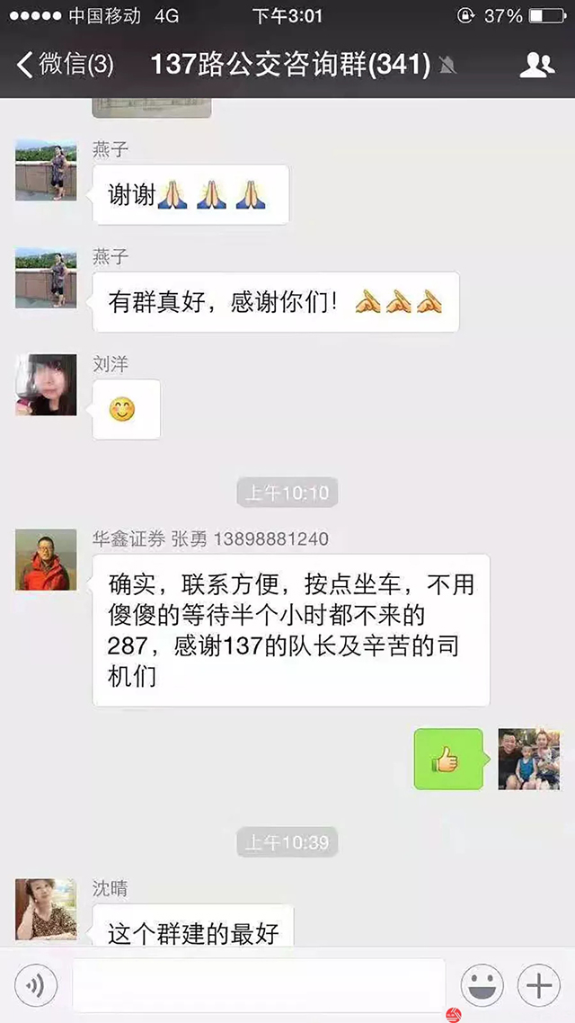 咨詢(xún)?nèi)旱慕⒖捎嗅槍?duì)性、高效率地向乘客們收集意見(jiàn)以及完善服務(wù)。自咨詢(xún)?nèi)航⒁詠?lái)137路車(chē)隊(duì)的投訴率明顯下降。據(jù)悉,沈蘇公司100路、108路、130路等線(xiàn)路也相繼開(kāi)通了公交網(wǎng)絡(luò)咨詢(xún)及投訴服務(wù)平臺(tái)。乘客上車(chē)后可以通過(guò)掃碼發(fā)表意見(jiàn)。目前更多線(xiàn)路正在嘗試通過(guò)創(chuàng)建線(xiàn)路微信群的方式,為市民提供更細(xì)致的公交服務(wù)。通過(guò)微信群,可有效幫助乘客有針對(duì)性地解決線(xiàn)路高峰期內(nèi)等車(chē)難、需要增加發(fā)車(chē)班次、物品丟失認(rèn)領(lǐng)等問(wèn)題,實(shí)現(xiàn)公交線(xiàn)路的精細(xì)化管理與服務(wù)。