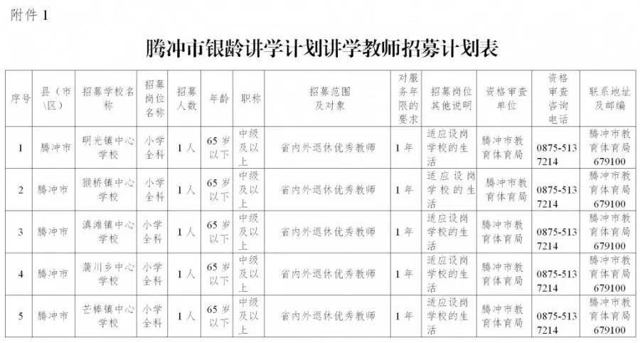 2019年騰沖市計劃招募“銀齡講學計劃”講學教師5名,全部為小學崗位。具體崗位詳見《騰沖市銀齡講學計劃講學教師招募計劃表》(附件1)。