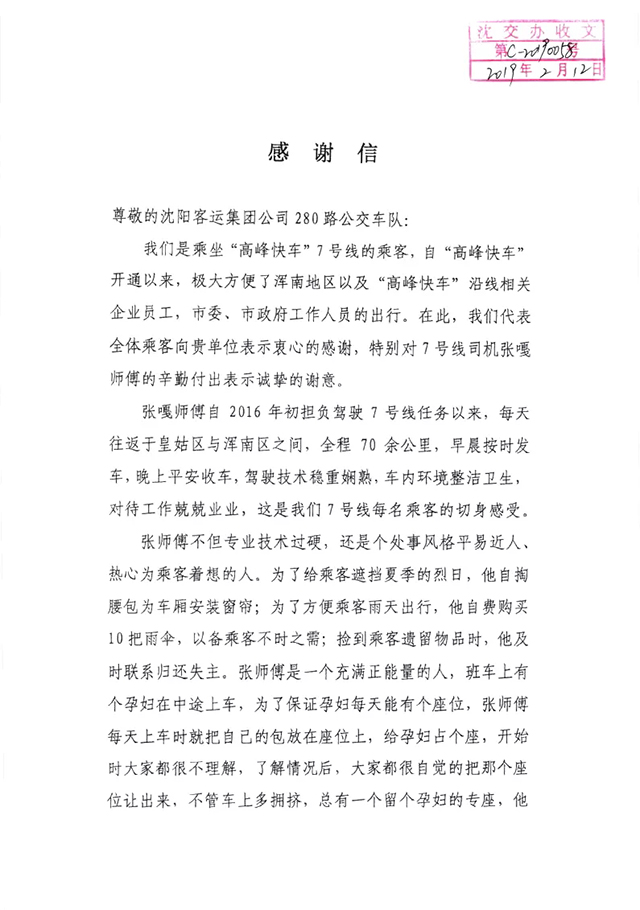 信的內容是,贊揚280路駕駛員張嘎的好人好事。為乘客提供了防曬窗簾、雨傘等用品,而且工作中拾到的錢包、手機、公文包等重要物品都能做到拾金不昧。對待持老年證及孕婦乘客主動幫其找座位。對待病患人員則用心照顧,盡力滿足他們的條件和要求。不僅如此,每天利用休息時間多次對車輛進行清掃和檢查,發(fā)現車輛隱患及時排除,保證安全運營。張嘎積極工作、文明駕駛、樂于助人、堅持365天微笑服務,他的工作熱情感染著身邊每一名同事,同時讓車上的乘客也真實感受到他優(yōu)質的服務。作為公交一份子,始終堅持“乘客至上”的原則。多年來,深深懂得肩上的重任,雖然沒有驚天動地的光輝業(yè)績,卻有任勞任怨、勤勤懇懇的敬業(yè)精神。